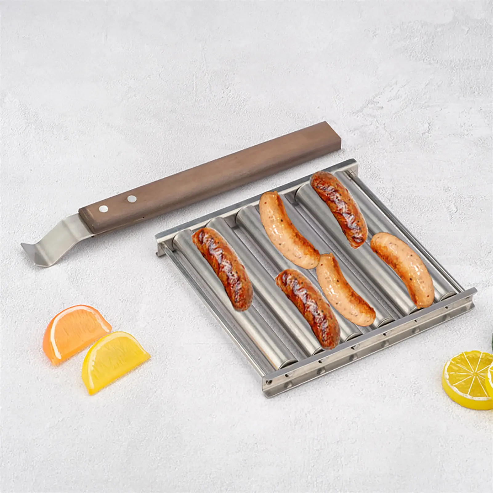 Stainless Steel Hot Dog Roller Grill With Extra Long Wooden Handle For BBQ Sausage Cooking net16x13.6cm